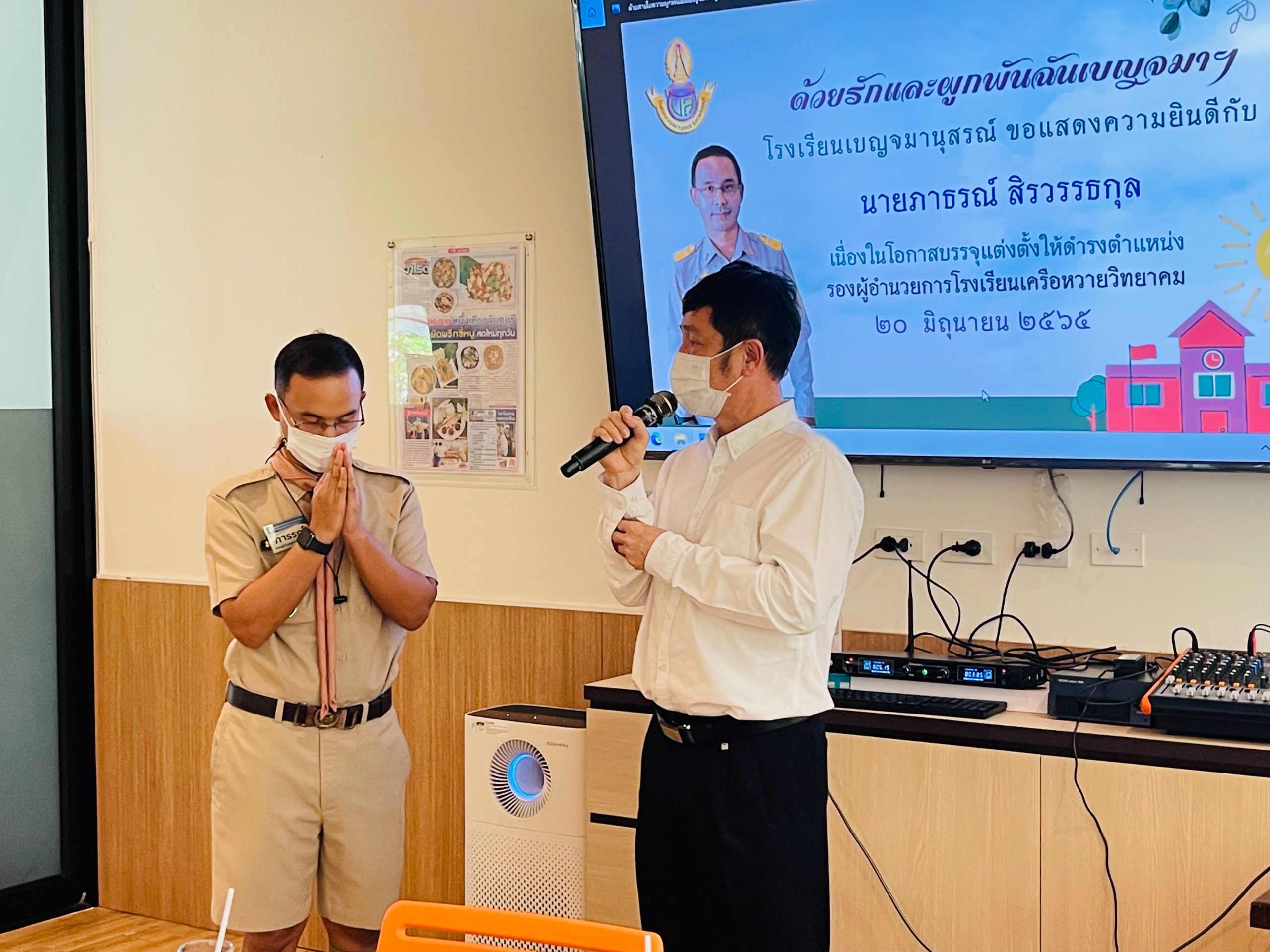 วันจันทร์ที่ 20 มิถุนายน พ.ศ.2565 โรงเรียนเบญจมานุสรณ์ จังหวัดจันทบุรี นำโดยว่าที่ร้อยตรี สมชาย ริมคีรี ผู้อำนวยการโรงเรียนเบญจมานุสรณ์ จังหวัดจันทบุรี พร้อมด้วยคณะรองผู้อำนวยการโรงเรียนเบญจมานุสรณ์จังหวัดจันทบุรี คณะกรรมการบริหาร และประธานกลุ่มสาระการเรียนรู้ฯ ร่วมแสดงความยินดีกับนายภาธรณ์ สิรวรรธกุล เนื่องในโอกาสได้รับการบรรจุแต่งตั้งให้ดำรงตำแหน่งรองผู้อำนวยการโรงเรียนเครือหวายวิทยาคม ขอแสดงความยินดีด้วยอย่างยิ่ง